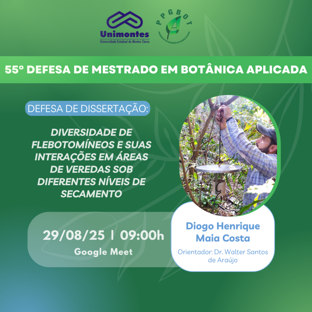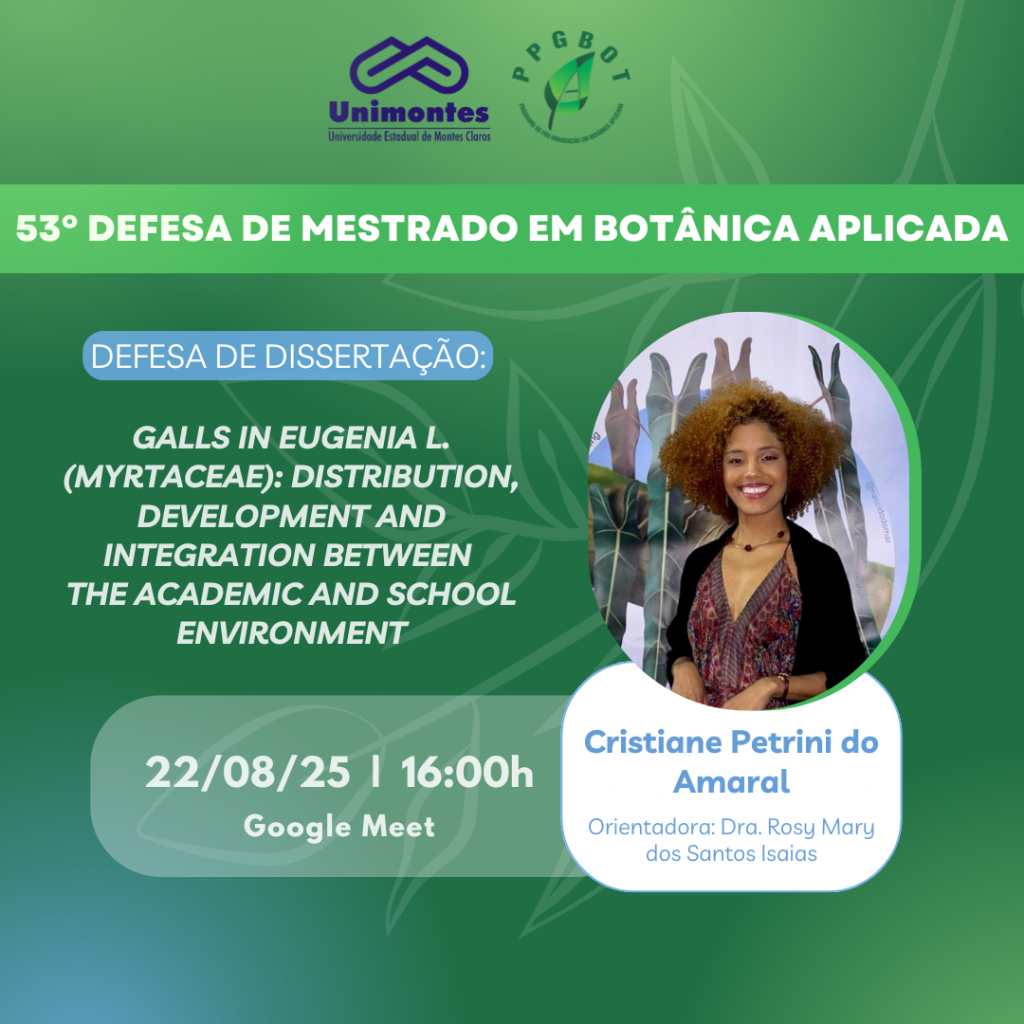 É com muita satisfação que comunicamos a 56° Defesa de Dissertação do Programa de Pós-graduação em Botânica Aplicada – PPGBot, da aluna Mylena Oliveira Andrade e orientador Dr. Otávio Cardoso Filho que será realizada no dia 29 de Agosto de 2025, às 14h00min no Auditório do Circuito de Conhecimento da Unimontes, Montes Claros.. 🌿