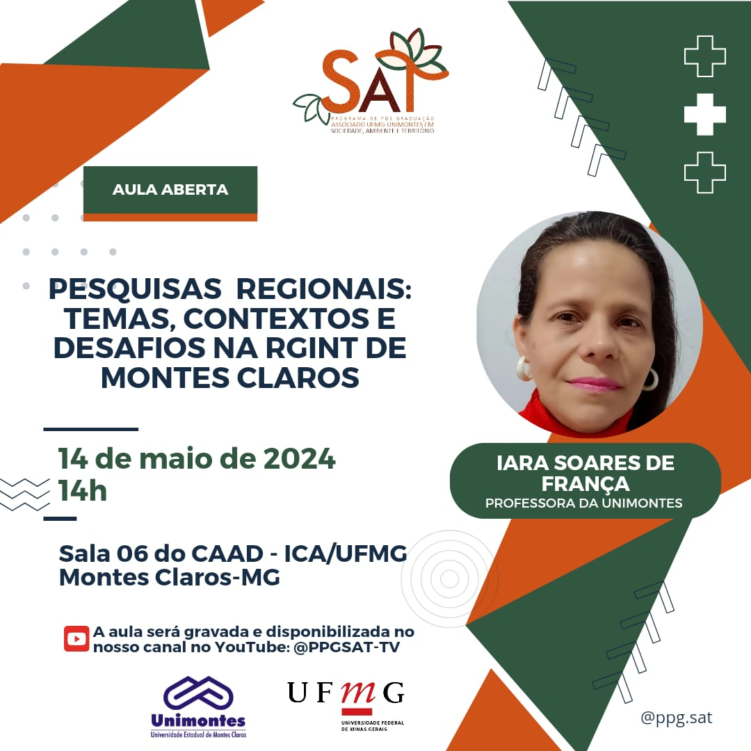 No dia 14 de maio, a Professora Iara França, do Programa de Pós-Graduação em Geografia (PPGEO) da Universidade Estadual de Montes Claros (Unimontes), ministrou uma palestra intitulada “Pesquisas Regionais: Temas, Contextos e Desafios na Região Intermediária de Montes Claros”. Esta palestra foi parte do Programa de Pós-Graduação UFMg-Unimontes em Sociedade, Ambiente e Território.
